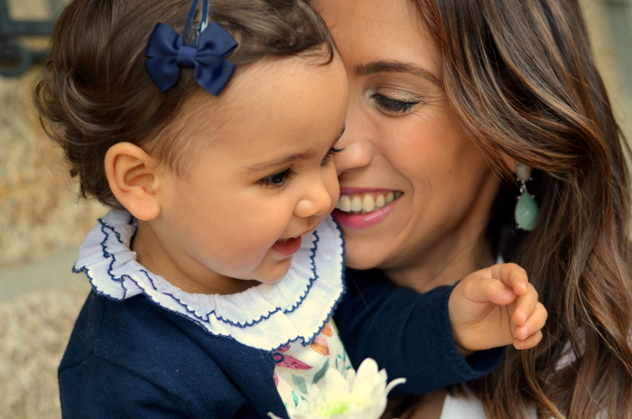Por coincidência, para a minha pimpolha os avós já lhe tinham oferecido este vestido e que até se assemelhou ao meu com o tema floral/tropical no seu esplendor. Na Francisca também tive que recorrer a uns agasalhos extra como este body de gola e o bolero, mas que na minha opinião combinaram muito bem. Adorei ver esta combinação com o azul marinho.